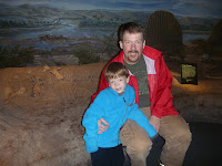 Mama, papa, Matt and Ben did spend Thursday at the Royal Tyrrell Museum in Drumheller while Tom and Sam tired Oma and Poopa out at all the local indoor playgrounds all day! Thank you guys for letting the oler boys experience the Dinosaur Museum. It was pretty amazing. The drive down into Drumheller is pretty cool. The Badlands are certainly different from any landscape the boys had ever seen. (other than the dinosaur exhibits at the Calgary Zoo) The first family of Albertosaurus that you see when you enter the museum was incredible and around every corner there was something new to see or touch. Papa liked the mammoth and sabre toothed tigers while Ben liked the dinosaur that you could climb inside and look out of his mouth. Matt had renamed the Dimetrodon (has a fin like back that looks like a ruffled potato chip) the "Chiposaurus". There were videos that they wanted to watch, I think the boys were tired and wanted to sit after all of the running from place to place. Matt and Ben tried to kiss all kinds of dinosaur skulls. Matt thought the giant live cockroaches were pretty cool. As we left the museum, we climbed up the steps so we could get a view of the Badlands. We then stopped at the "World's Largest Dinosaur" to climb up all the steps inside of him and look out of his mouth at Drumheller. We got home late and mama and papa are beat. What a fun day. The MacNeills